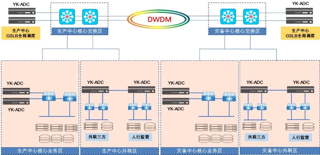 • 生产中心和灾备中心为对称部署,两个中心使用波分技术实现互相连接;